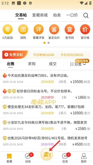 1、在爱藏主页面,点击底部的【卖】按钮,会弹出发布功能菜单,从中选择对应的发布类型即可。