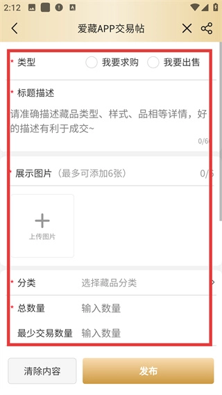 3、在交易帖编辑页,选择交易类型(求购/出售),填写标题、上传图片、选择分类及填写数量等信息。