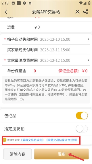 4、在信息填写完后,勾选同意规则后,点击【发布】完成交易帖发布。