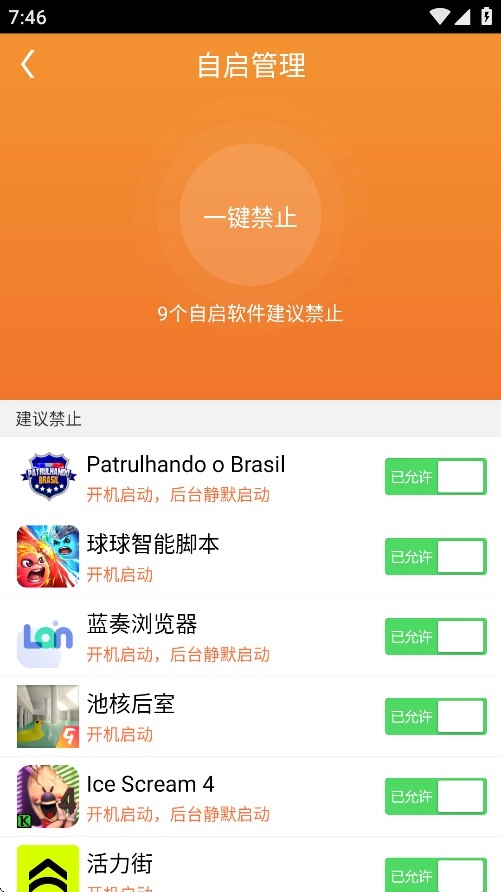 4、管理开机启动项,对占用手机内存、频繁推送广告的应用说不