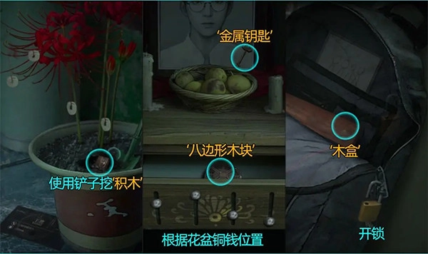 3、拿小铲子把花盆里的土挖开,捡起【积木】,拉开抽屉拿到【八边形木块】,再拿起【钥匙】打开背包,取出【木盒】就行啦。
