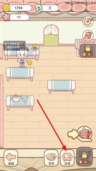 1、进入妖怪旅店主界面,找到下方的设施按钮并点击,点击后进入家具选择页面。