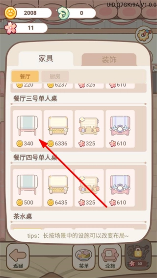 2、在家具页面选择对应区域的家具,比如餐厅分类下的餐厅三号单人桌。