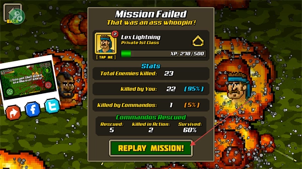 4、若任务失败,点击REPLAYMISSION!按钮重新开始任务,积累经验提升战斗技巧。