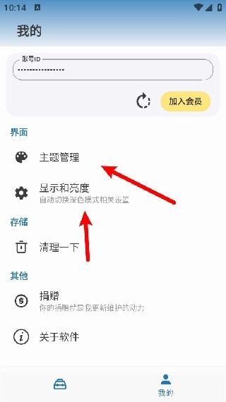 4. 在“我的”页面,可对主题、显示及亮度进行调节。
