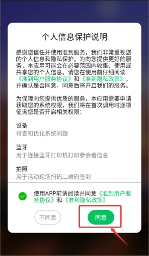 1、在准到应用里勾选相关协议,然后点击“同意”按钮,以此完成权限确认操作。