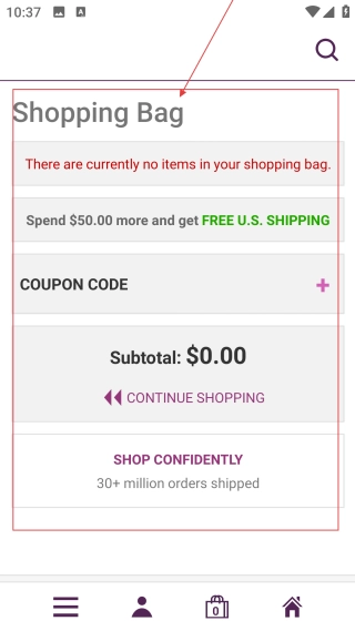 3、这是购物袋管理界面,会显示【袋内物品状态、优惠提示】,支持优惠券代码使用及继续购物操作。