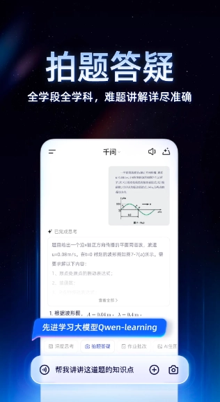 1、全新升级的Qwen-Learning学习模型,解题能力全面覆盖全学段各个学科,拍题答疑的准确性进一步提升。