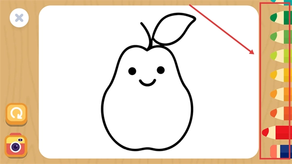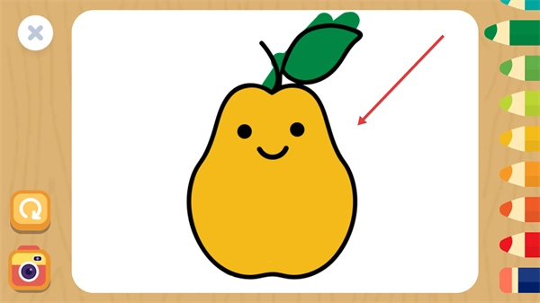 3、进入梨子涂色界面,从右侧的【彩色蜡笔】区域挑选颜色,为梨子的轮廓填充色彩,以此锻炼细致观察的习惯和色彩搭配的能力。