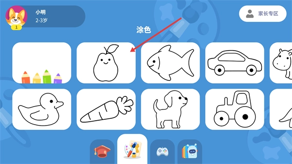 2、进入【涂色】任务界面后,点击【梨子图案】即可开启涂色环节,借此引导孩子进行创意涂色,以锻炼其色彩感知能力与动手能力。