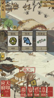 在“娱乐”和“装饰”项目中,所有的建筑和花木都能增加城市的繁荣度,每当繁荣度达到一定条件时,就会解锁一个民居,从而增加居民人口数量,为城镇提供更多的劳动力。