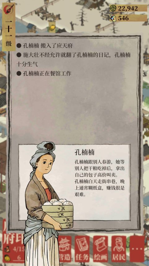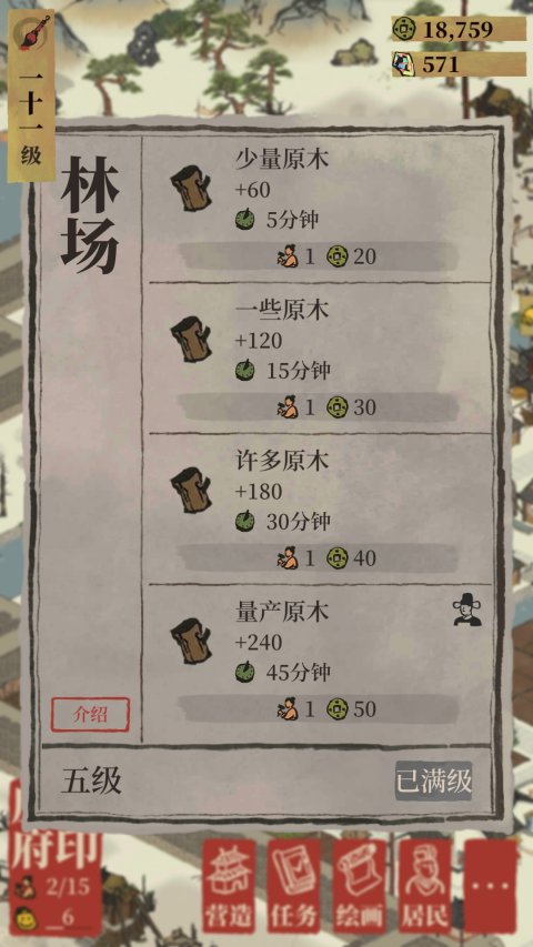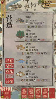 在“居住”类别里,主要涵盖能增加人口的民居、用于储存物资的仓库以及可赚取铜钱的商业建筑。至于“生产”,存在多种资源建筑,像农田、林场、餐馆以及造纸厂等,并且这些建筑相互关联紧密。例如,农田产出的蔬菜能在餐馆里加工成食物;林场产出的原木,可在锯木厂制成木板,继而在造纸厂制成纸张。