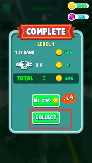 4、玩家完成关卡后,会显示关卡完成提示以及获得的金币等奖励信息,点击COLLECT按钮领取奖励,点击即可进入下一关。