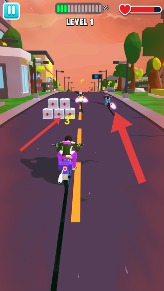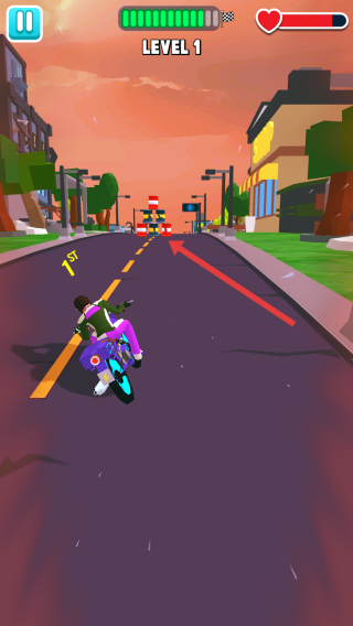 2、玩家进入游戏后,操控摩托车在城市道路上前进,通过左右移动屏幕来控制摩托车的方向,超越前方的其他摩托车手。