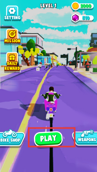 1、玩家完成游戏后,点击进入游戏主界面,再点击PLAY绿色按钮,即可进入摩托车特技冲刺的游戏关卡。