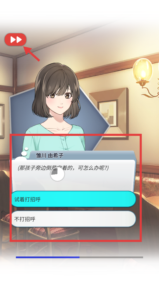 3、剧情推进过程中会出现选择情况。当看到有人旁边有空位时,要是想互动,就选择“试着打招呼”;要是不想互动,就选择“不打招呼”。不同的选择会触发不一样的剧情。