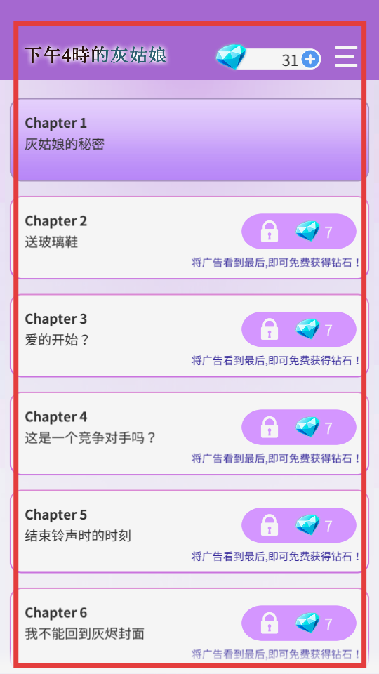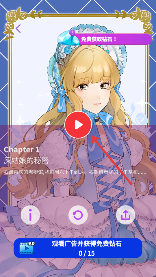 1. 踏入灰姑娘的秘密章节,点击播放按钮即可推动剧情发展。不仅如此,玩家还能够通过观看广告来获取免费钻石,从而助力自身的游戏进程。